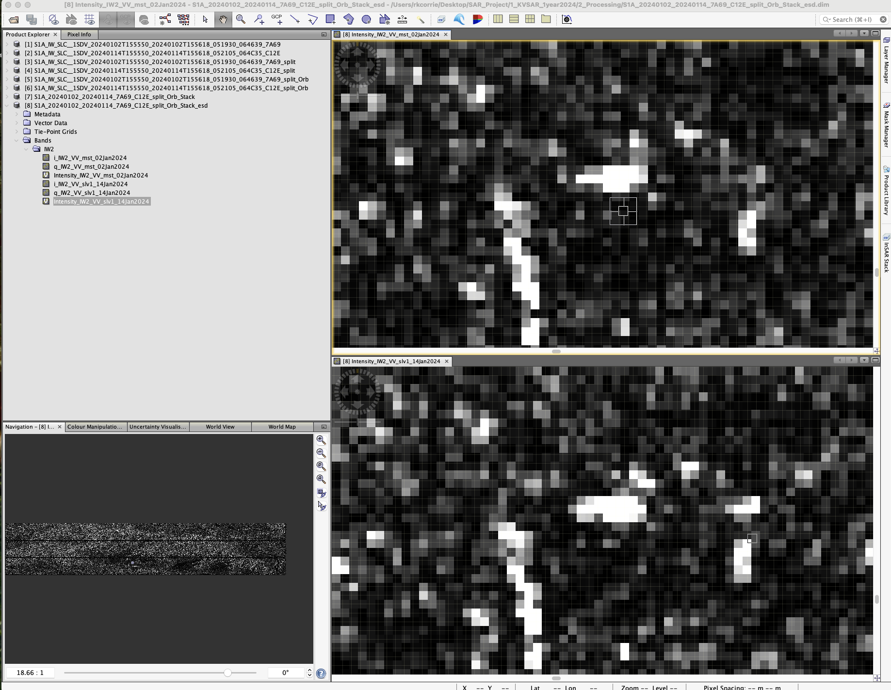 I loaded both Intensity bands from the stacked dataset and tiled vertically. When I move the cursor around one band, it also moves in the other displayed band, but there is visible offset of around 25 pixels. This is after ESD has been applied. Maybe I am doing this wrong? If I use Layer Manager and load both intensity bands, and use the swipe feature, then the pixels seem perfectly aligned both before and after using ESD operator.