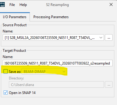 Caused: org.esa.snap.core.gpf.OperatorException: Not able to write product file: ‘C:\Users\young\SENTINEL_2\S2B_MSIL2A_20260106T235509_N0511_R087_T54DVL_20260107T003922_s2_b3.dim’