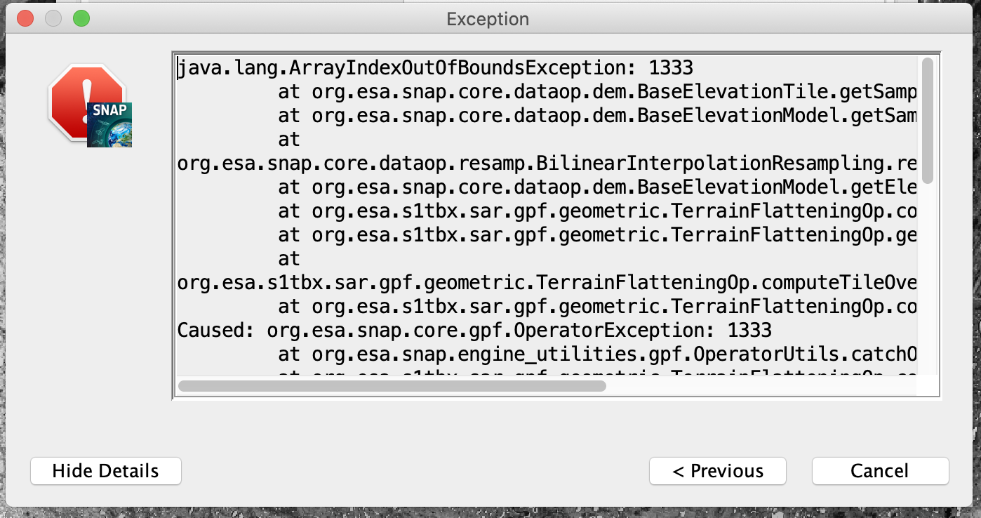 I’m having issues with the RTF step in my GRD processing. I’m attaching the error I’m seeing. The images are stack averages of multiple dates, but the stacks and the averages are working well in SNAP (I see no issues with any bands). Before creating stack averages, for each file I: