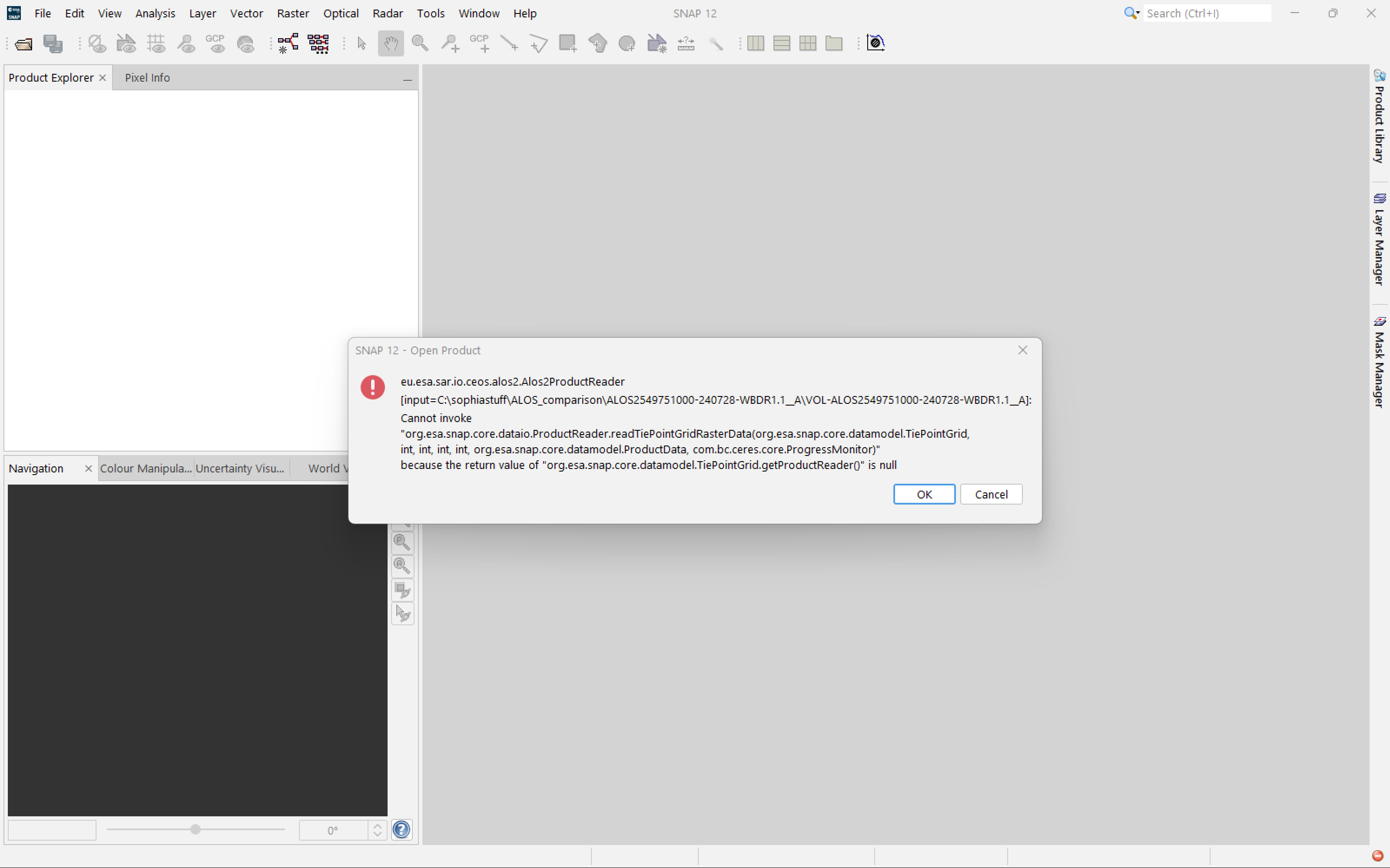 I seem to be unable to open ALOS-2 data in SNAP 12. If I try to go file-> import-> ALOS-2 CEOS Products then try to open the “VOL” file I get this error:
