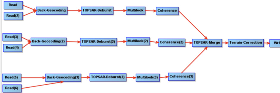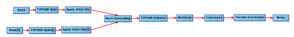 Read – split – apply orbit file – back geocoding – topsar deburst – ML – coh – TerrCorr - write