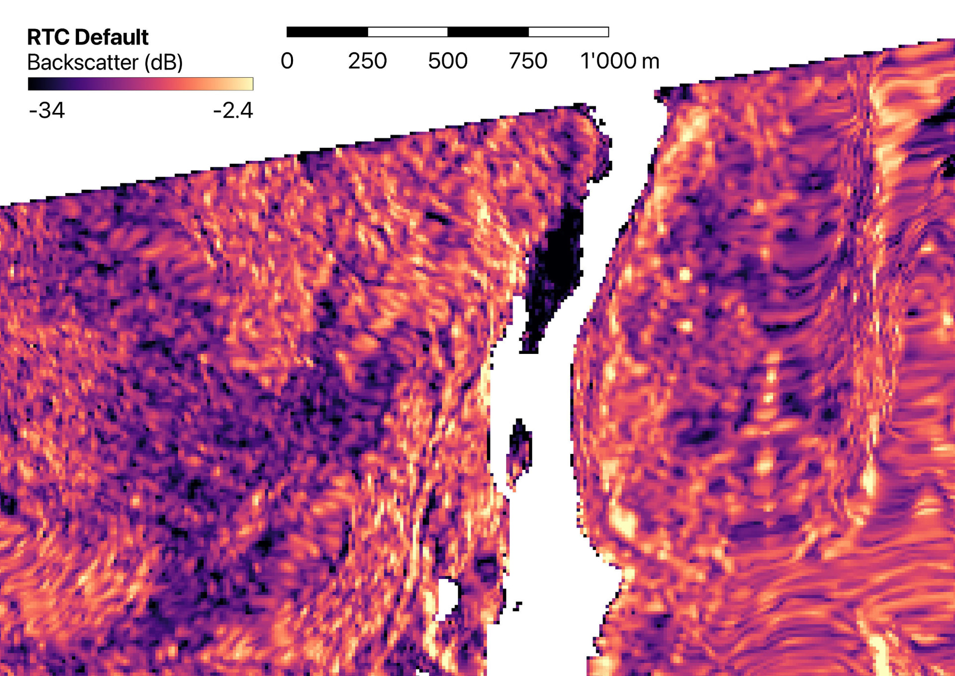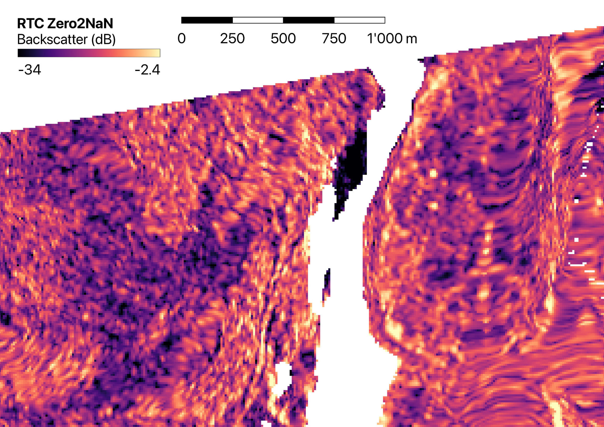 No-data values, present around the burst edges and in shadowed areas (after terrain flattening) are stored as zeros. While SNAP’s UI correctly identifies and masks these during visualization, the Terrain Correction operator seems to treat them as valid data values (0) during interpolation. This causes artificially low values along seams.