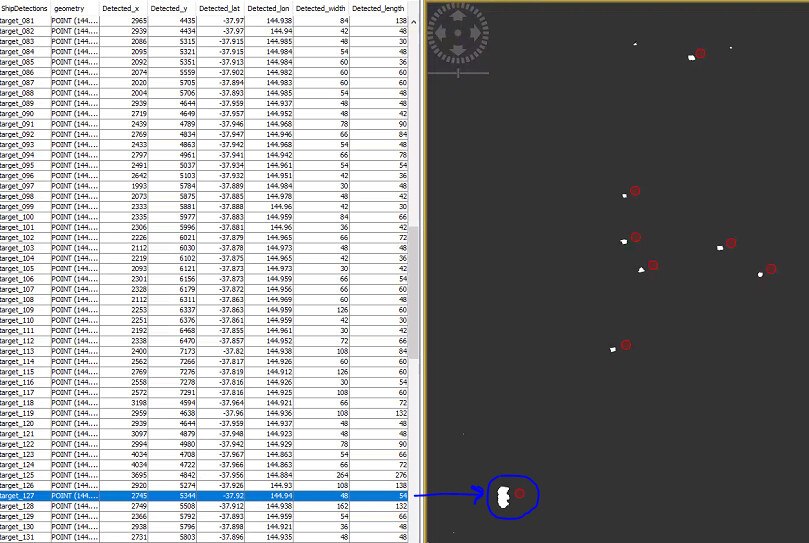 The ship detected coordinates for target_127 is as shown above in the image. This is the same in SNAP (Pixel info) but in the CSV the location is different for target_127.